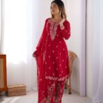 Women’s Georgette Embroidery Straight Kurti with Pant And Dupatta Set